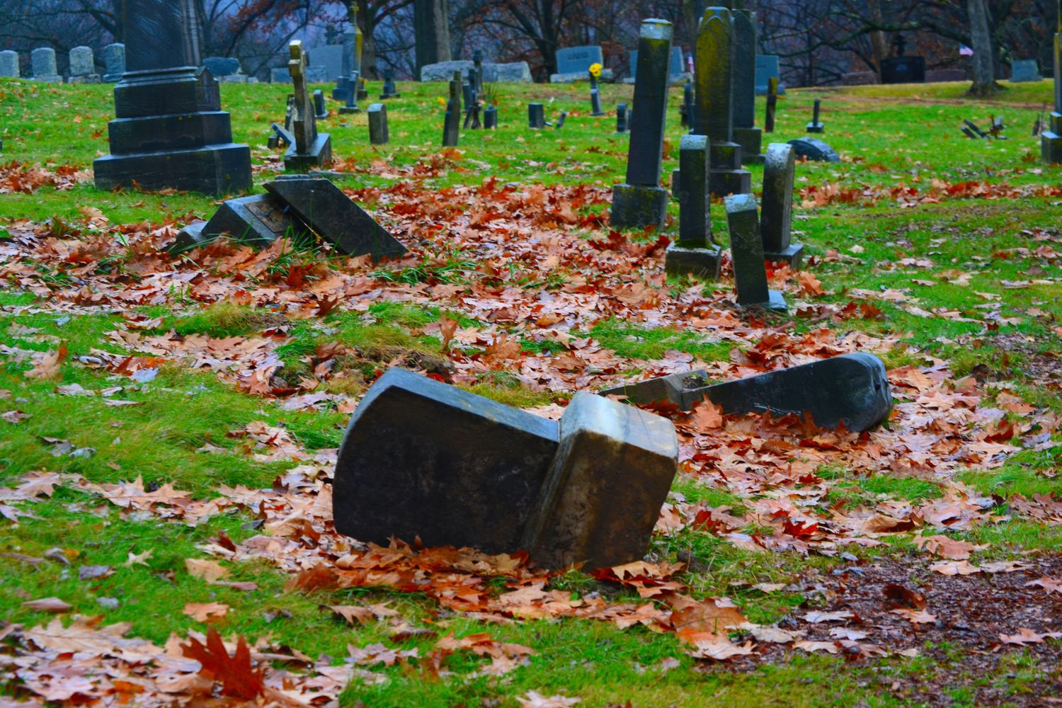 In a quiet cemetery, weathered gravestones tilt and topple, surrounded by fallen autumn leaves. The scene speaks to the passage of time, as the once-sturdy markers slowly succumb to nature's forces. The peaceful surroundings contrast with the decay, creating a reflective moment of both beauty and impermanence. Monongahela, Pennsylvania.