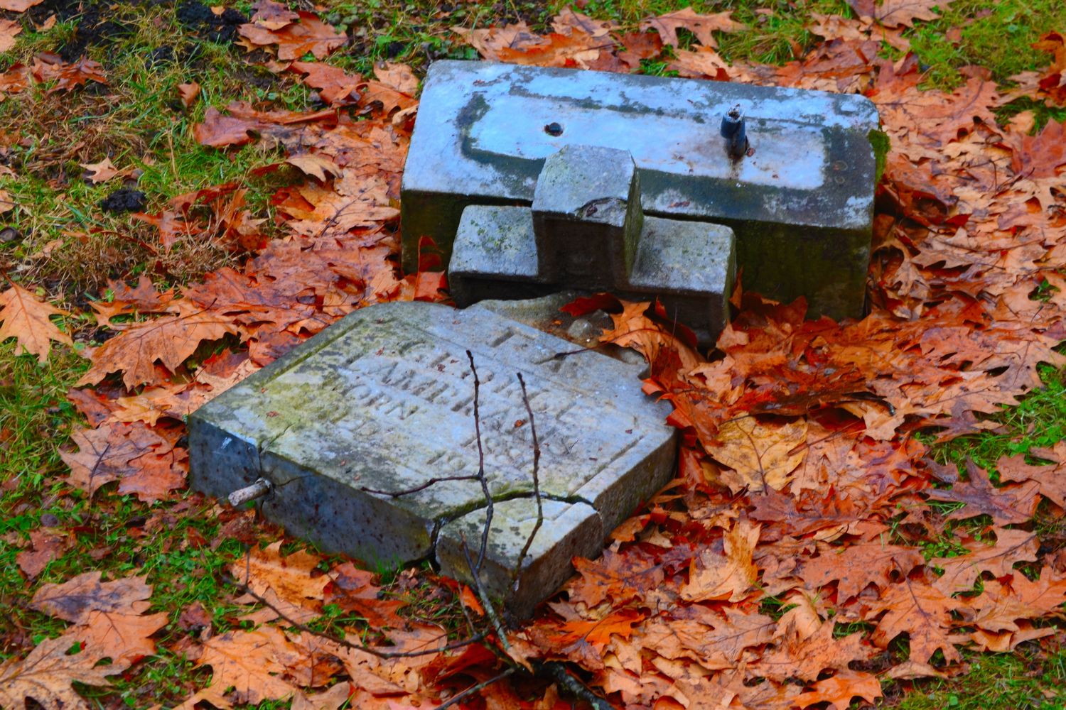 Weathered grave markers lie overturned and fractured, surrounded by late-season leaves. A documentary-style photograph capturing age, neglect, and the subtle evidence of history fading into the ground. Monongahela, Pennsylvania.