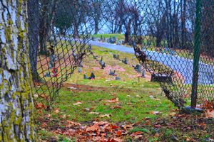 A weathered, torn fence frames a view of an old cemetery, with scattered leaves and leaning gravestones. The fence’s rusted and bent wires symbolize the passage of time and the impermanence of both nature and man-made structures. Behind the broken barrier, the cemetery remains undisturbed, a silent testament to history. Monongahela, Pennsylvania.