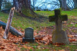 Two gravestones stand side by side, weathered by time, with moss beginning to overtake their surfaces. One marks the resting place of John Ferguson, who passed away in 1914. A fallen tree branch lies nearby, its broken form adding to the sense of impermanence. Autumn leaves blanket the ground, underscoring the passage of time and the quiet stillness of this resting place. Monongahela, Pennsylvania.