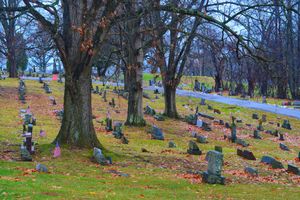 A peaceful cemetery scene framed by the bare branches of large trees, their skeletal limbs reaching toward the sky. American flags flutter gently by the gravestones, offering a quiet tribute to those who rest there. The fall leaves blanket the ground, symbolizing both the end of a season and the passage of time, as the road winds through this serene resting place. Monongahela, Pennsylvania.