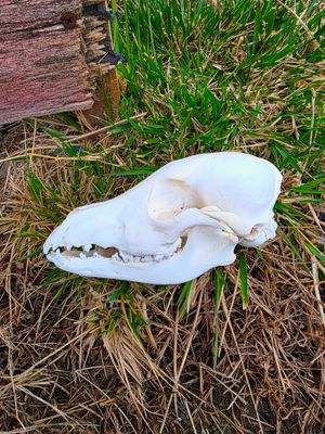 The skull of a juvenile coydog is photographed resting in grass in rural Pennsylvania. Captured in natural light, the image emphasizes surface detail and form, contrasting bleached bone with living ground. This photograph continues a quiet documentation of physical remains and the space left behind. The subject was a beloved companion named Sassafras.