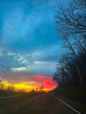 A stretch of pavement leads into fading light. The sky burns briefly, the road darkens, and the boundary between departure and arrival begins to dissolve. Pennsylvania.
