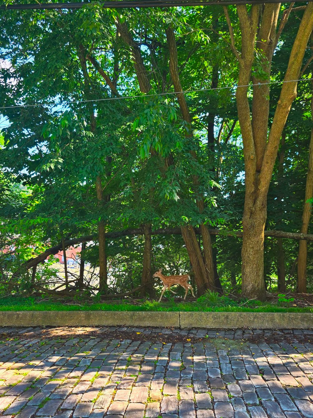 A peaceful moment captured in nature, featuring a young deer grazing near a quiet forest edge. The lush greenery and dappled sunlight create a tranquil atmosphere, while the cobblestone path hints at the gentle passage of time in this serene environment. Pennsylvania.