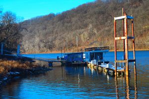 A small floating dock sits tethered to the riverbank, its rusted pylons rising against winter hills. The water reflects industry long past and routines still quietly continuing. Along this stretch of river, access remains while permanence slowly erodes. Monongahela, Pennsylvania.