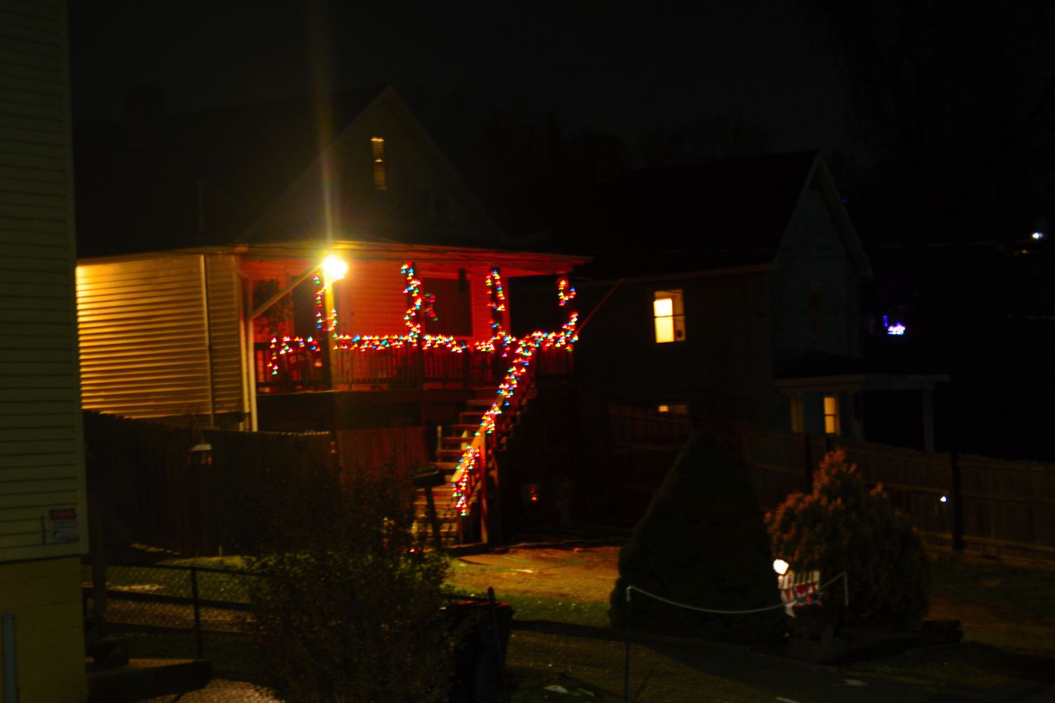 Colored string lights outline a back porch and stairway, cutting through an otherwise dark residential block. The artificial glow isolates the structure from its surroundings, suspending it between visibility and concealment. Festive illumination becomes a temporary surface treatment, emphasizing distance rather than warmth. Charleroi, Pennsylvania.