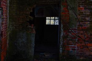 A heavy, dark metal door sits recessed within a deteriorating brick façade, its surface absorbing most of the light. Near the top, a small grid of square windowpanes reflects pale daylight and bare tree branches from outside, offering the only hint of what lies beyond. Surrounding bricks are fractured and misaligned, with chunks missing and mortar eroded, while vines and grime creep across the surface. The doorway feels both closed off and watchful—an intact threshold embedded in an otherwise collapsing structure. Pennsylvania.