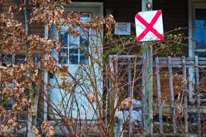 A boarded porch and sealed doorway are partially obscured by dormant vines and dead leaves. A red X sign interrupts the domestic geometry, reducing the structure to a recorded condition rather than a residence. Vegetation and signage compete for the frame, flattening the space into surface, color, and signal. Pennsylvania.