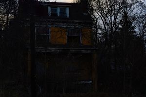 An abandoned brick home recedes into shadow as dusk settles around it. Windows sit hollow and dark, their frames barely visible through tangled branches and overgrowth that press tightly against the structure. The remaining yellow brick flickers faintly through the dimness, suggesting warmth long gone, while power lines and tree limbs fracture the façade into layers of obstruction. This photograph lingers in the quiet moment where a house is no longer watched, no longer entered—only slowly absorbed by time, vegetation, and fading light. Pennsylvania.