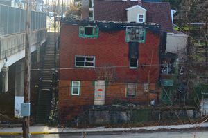 A fire-damaged brick building stands stripped of function but not of intent. The roofline is scorched and sagging, windows blown out and blackened, interiors exposed through fractured frames. A small “For Sale” sign remains fastened to a boarded doorway, a quiet and unsettling marker of value against visible loss. Concrete stairs climb the left side of the structure, compressing the building into its urban surroundings, while power lines cut across the façade like scars. This image confronts the tension between ruin and real estate, where ownership persists long after livability has burned away.