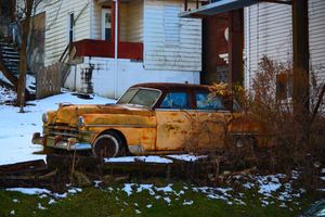The same mid-century sedan appears further consumed by its surroundings, partially submerged in brush, timber, and thawing snow. Domestic architecture presses close behind it, compressing space and time until the vehicle reads as fixed debris rather than transportation. Rust, plant growth, and structural repetition reduce the object to surface and form. Homestead, Pennsylvania.