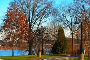 A maintained riverside walkway sits in winter light along the Monongahela River. Bare trees, ornamental lighting, and trimmed grass frame the water, presenting a controlled and orderly landscape. The photograph contrasts civic calm with the surrounding corridor where industry, transit, and loss persist just beyond view. Monongahela, Pennsylvania.