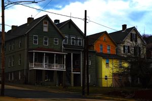 A descending street leads toward warehouses and utility lines at the base of the hill. The image suggests limited movement within a fixed industrial landscape. Charleroi, Pennsylvania.
