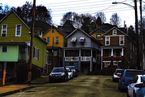 Power lines stretch across the frame, stitching together a cluster of hillside homes. The photograph reflects the quiet complexity of everyday infrastructure shaping a residential landscape. Charleroi, Pennsylvania.
