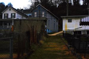 A worn strip of grass leads through close-set houses, suggesting routine movement rather than destination. The scene balances structure and neglect, offering a quiet portrait of place without spectacle. Charleroi, Pennsylvania.