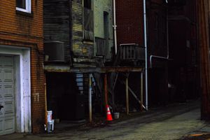 Behind the storefronts, the town exhales. Rusted balconies, sagging stairwells, and patched siding stack lives vertically, unseen from the street. A single traffic cone stands watch like a quiet apology, marking danger long after anyone stopped listening. This is the working back—where buildings age honestly, and nothing is meant to be looked at, only endured. Charleroi, Pennsylvania.